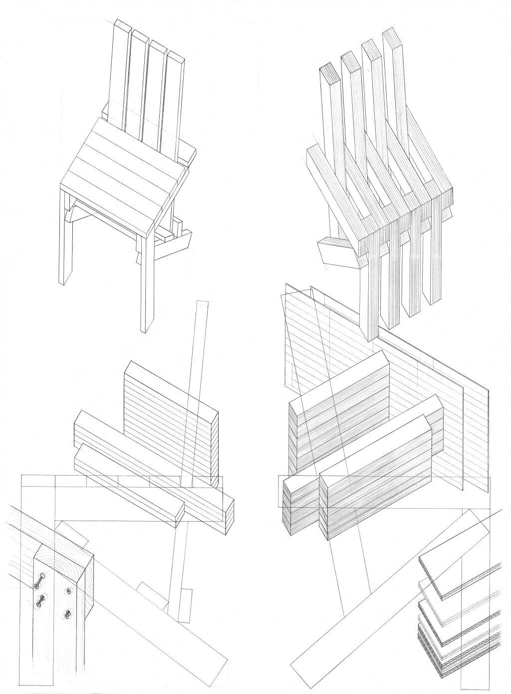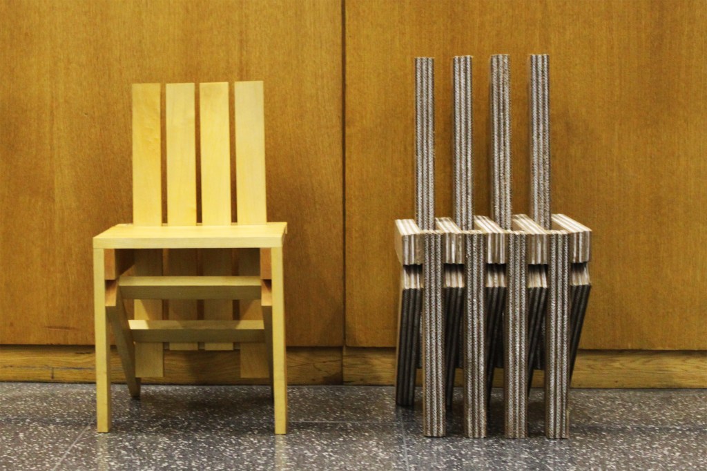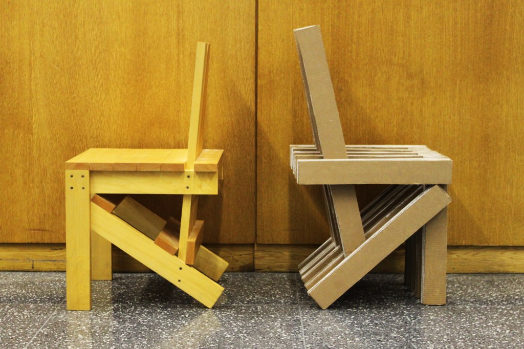 Using a series of laminated cardboard pieces in three lengths (the original chair had four different lengths) and created chair that both resembles and takes inspiration from the original. The structure of the cardboard required more vertical supports than the wood which we integrated into the design using the modular of the laminated cardboard. The back of the chair was lengthened to add comfort and painted every other layer white to emulate the wood grain of the original chair.