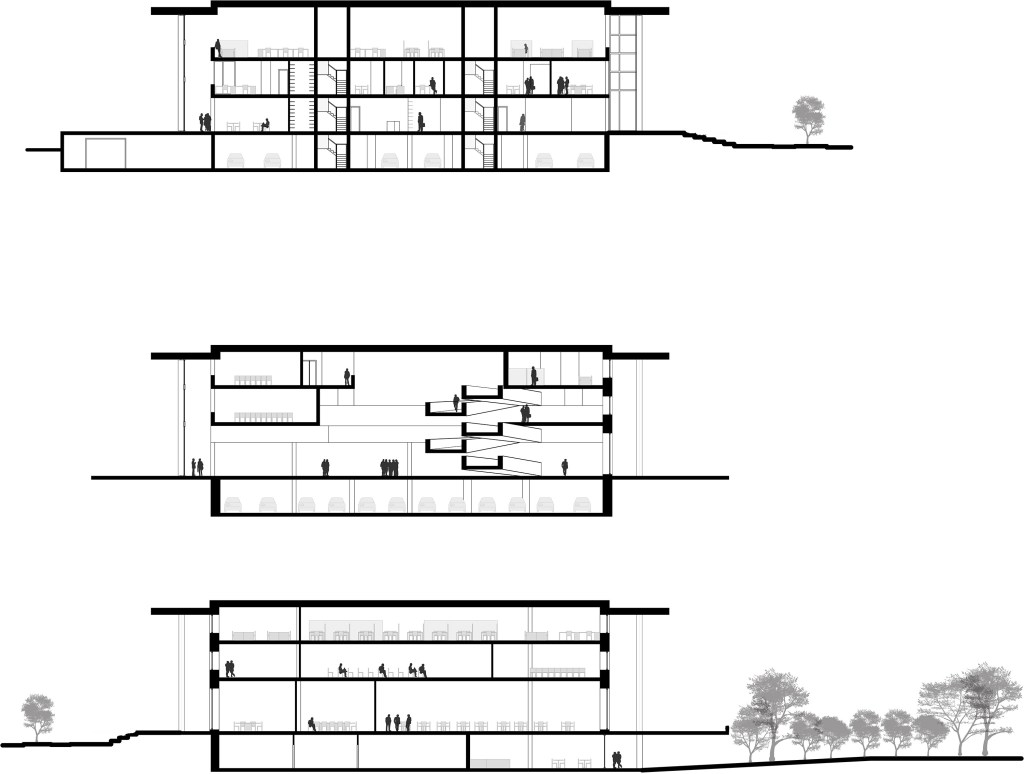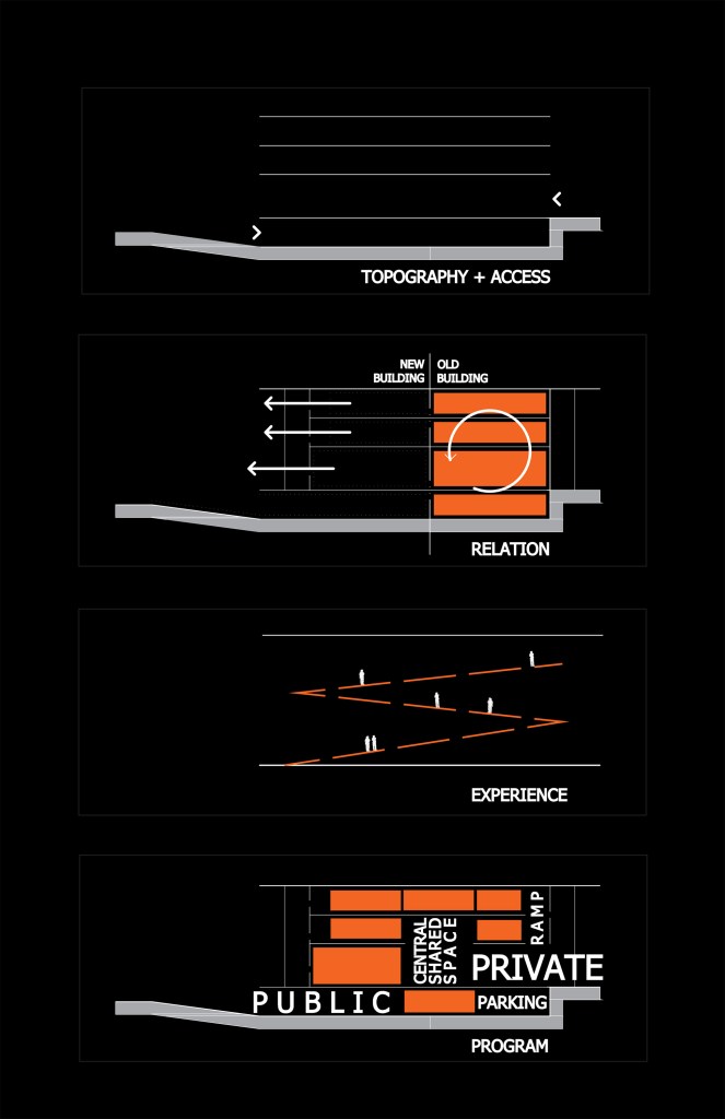 The original large floor plates created dark isolated interiors which we strove to open to the exterior and create an experience when moving through the building. Thinking of the first floor as a street through the building, an atrium emerged centralizing the circulation in an interior ramp up through the building and bringing people through the first floor to the garden in the back where a ramp brought them to the backyard and raped them down to the sunlit cafeteria below.