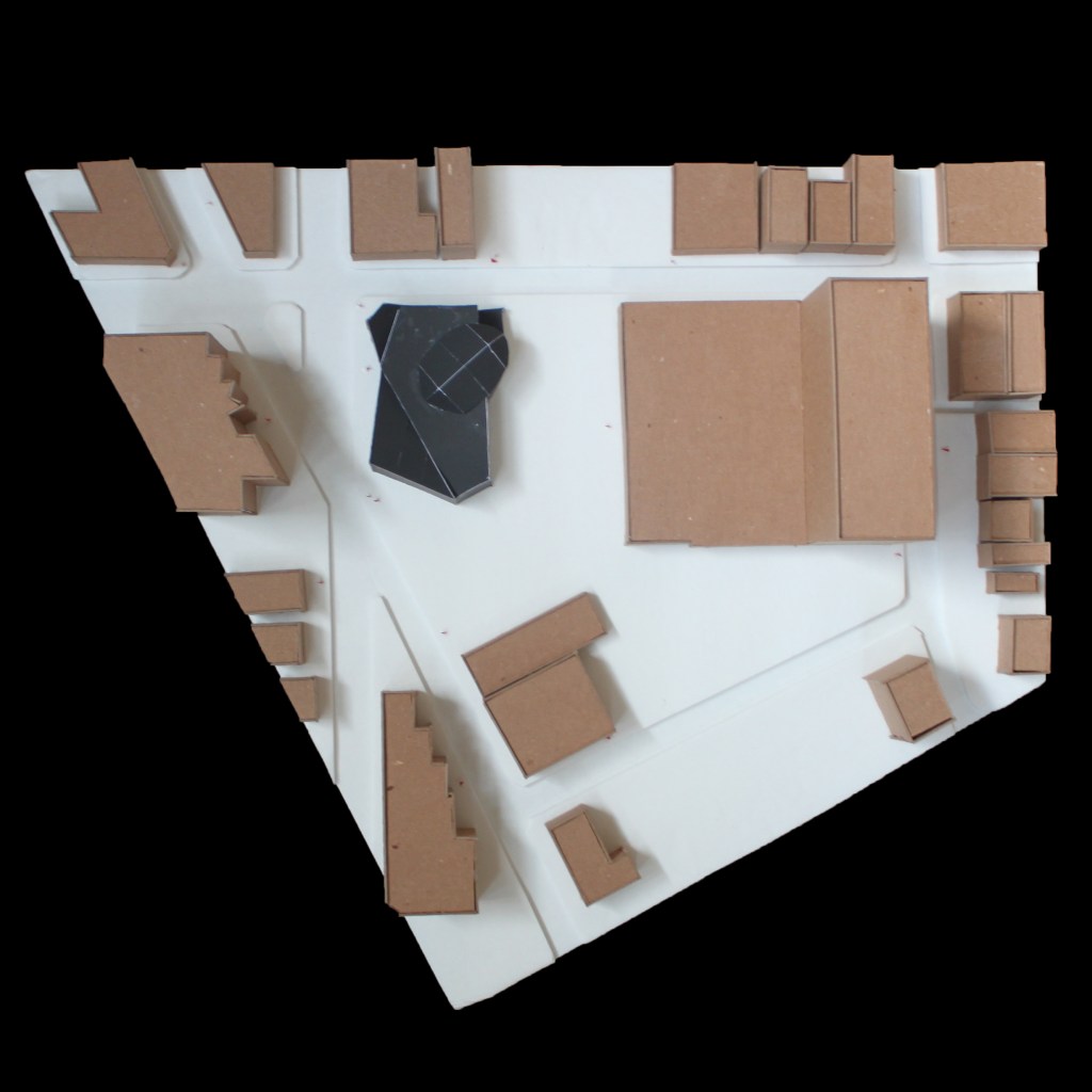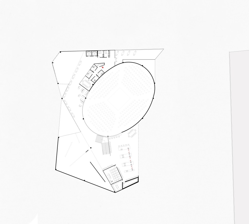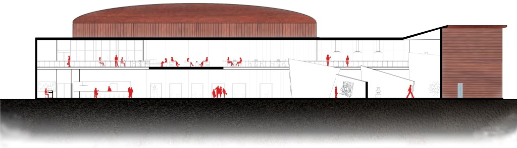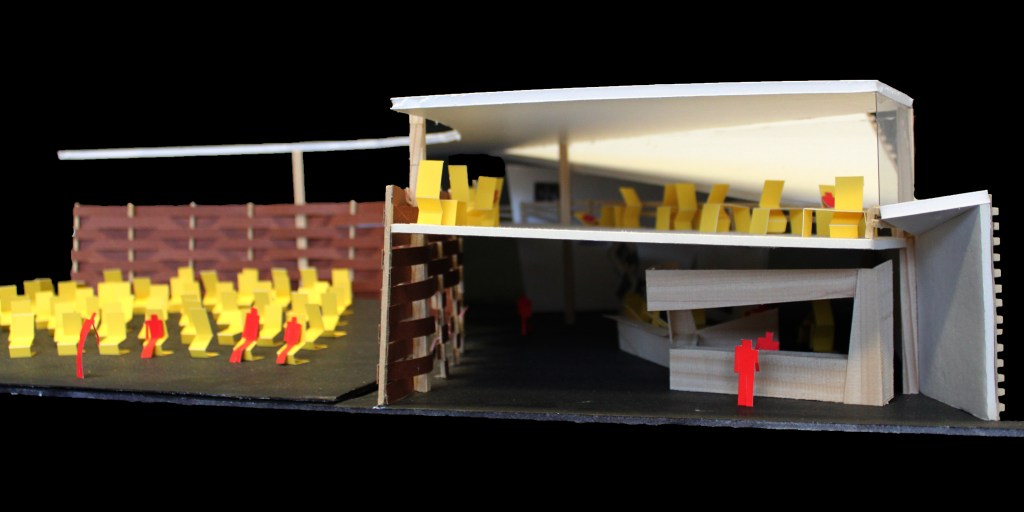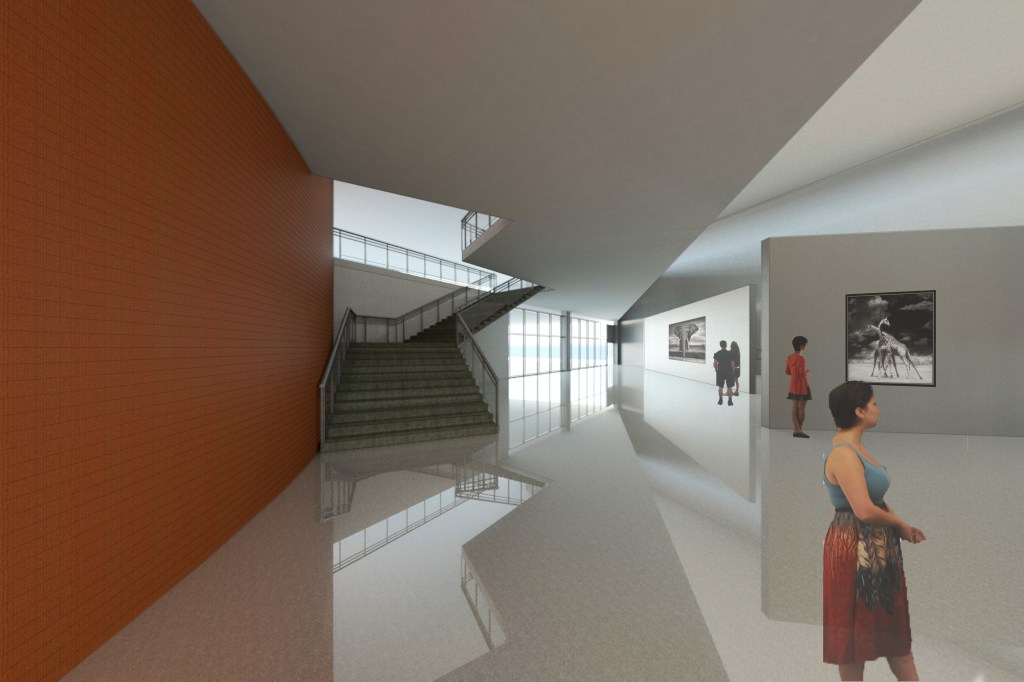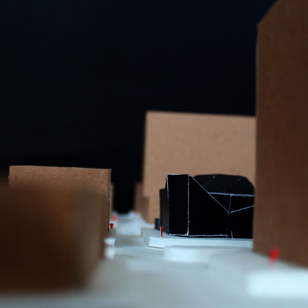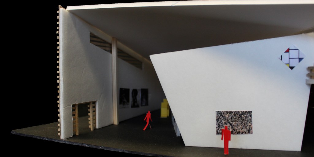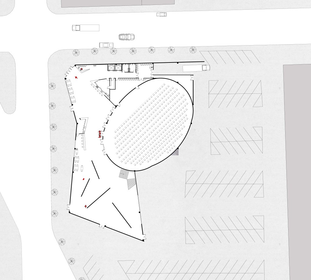 An investigation of the intersecting of activities produced a hybridization of spaces which took the form of an open floor plan in which the activities are visible and thus inviting for people to engage in all aspects Uptown has to offer. The activities are encouraged to flow together, such that the cafe seating is within the gallery space and the theater functions as extras seating when there is no performance. The circulation spaces are wide to encourage pausing.