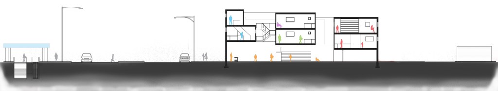 The building has cavity masonry walls on the exterior, similar to the many masonry buildings in the neighborhood, and wood frame interior walls. The floor plates are precast concrete and are easily able to span the width of the building.
