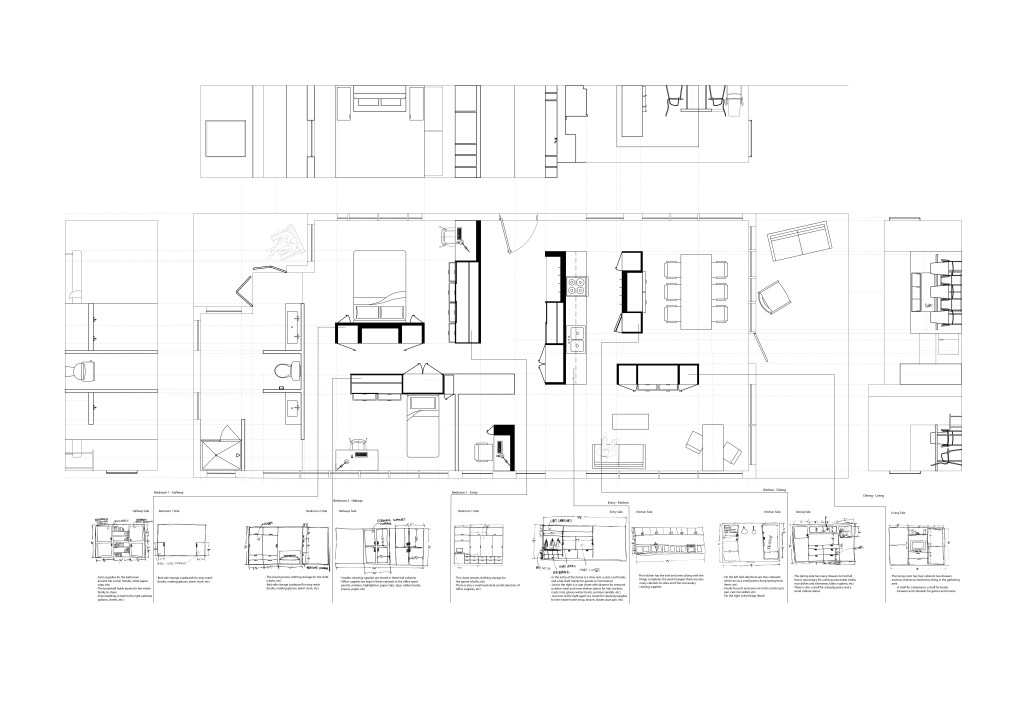 While the project began as an exercise in proportions and scale of living arrangements for a small family, it transitioned into an investigation of sliding planes and the study of privacy. How do you define spaces and create privacy once you remove the doors? What happens when the only walls that remain are functional to the home and not only for separation?