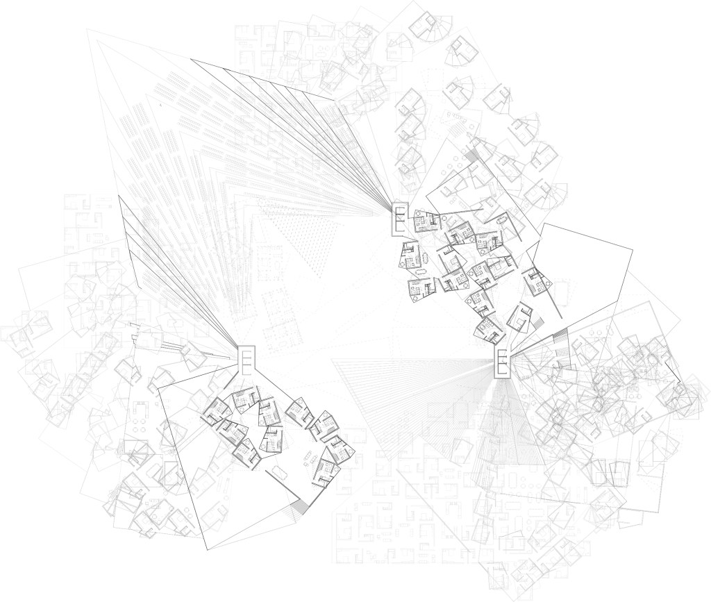 As the towers grow, the plate has more private amenities attached to the unit with unblocked views of the surrounding region. Individual units extend upwards along an infrastructural bathroom core, rotating through the plates and puncturing them. The units have smaller more secluded terraces which create interior atriums through the large plates and smaller neighborhoods begin to form within the city through the gradient in levels of interiority. The communities provide a variety of living conditions from communal to more individual with a variation in views and terrace types. As the durations of nomads stay varies greatly, the need for a variety of spatial and living conditions is required to cater to the needs of each nomad population.